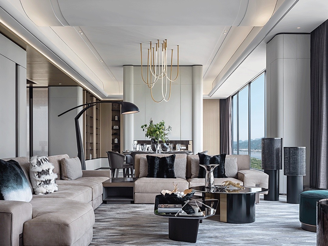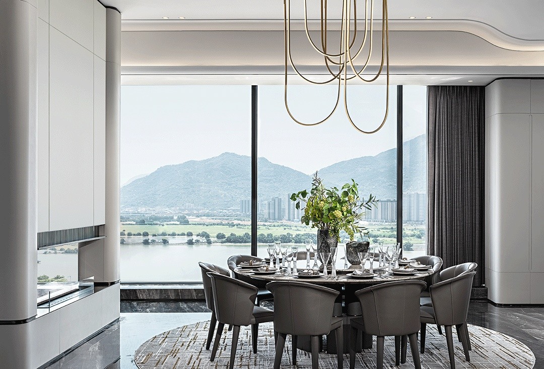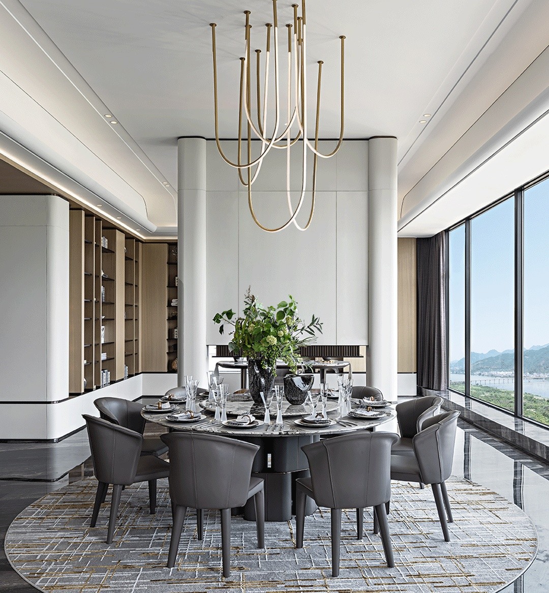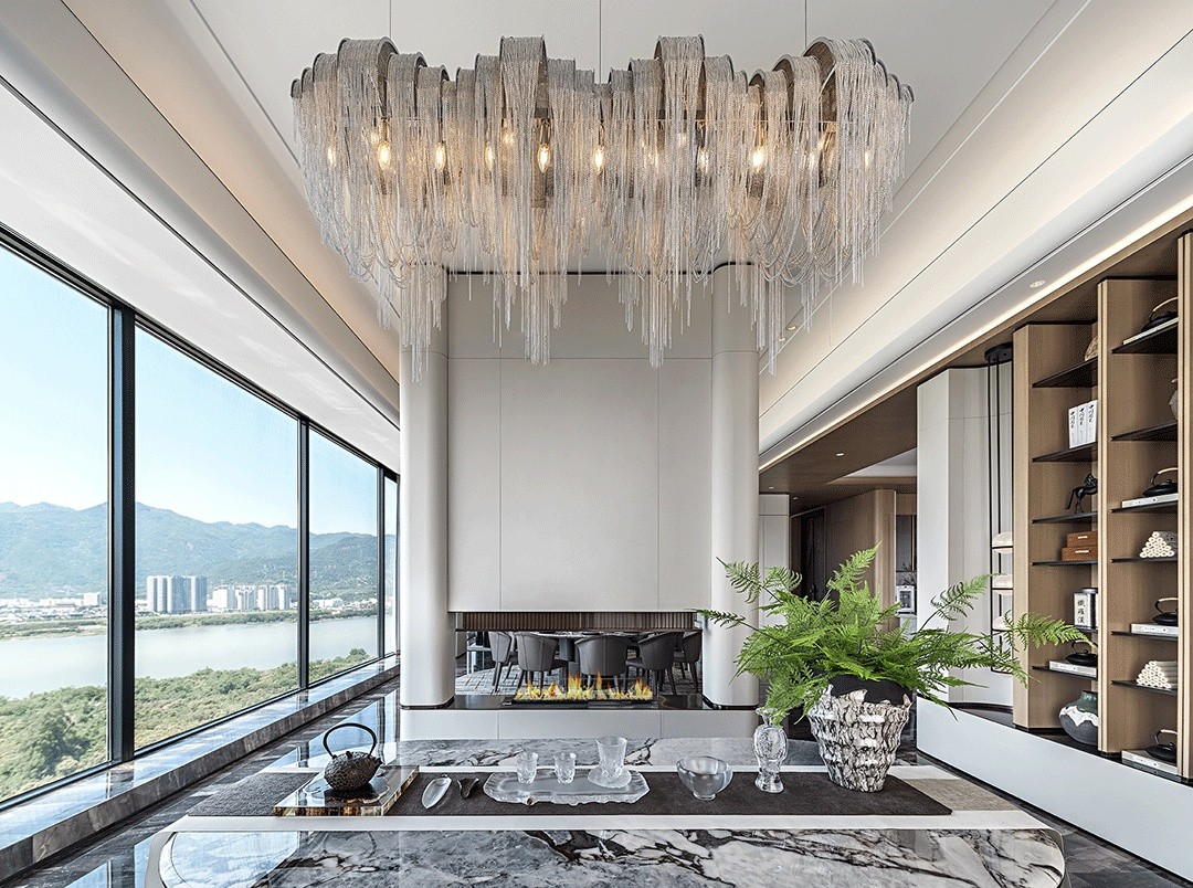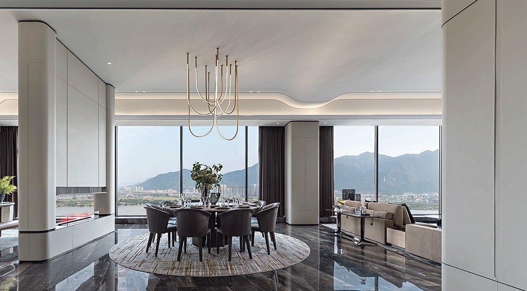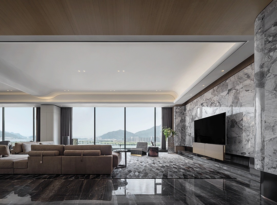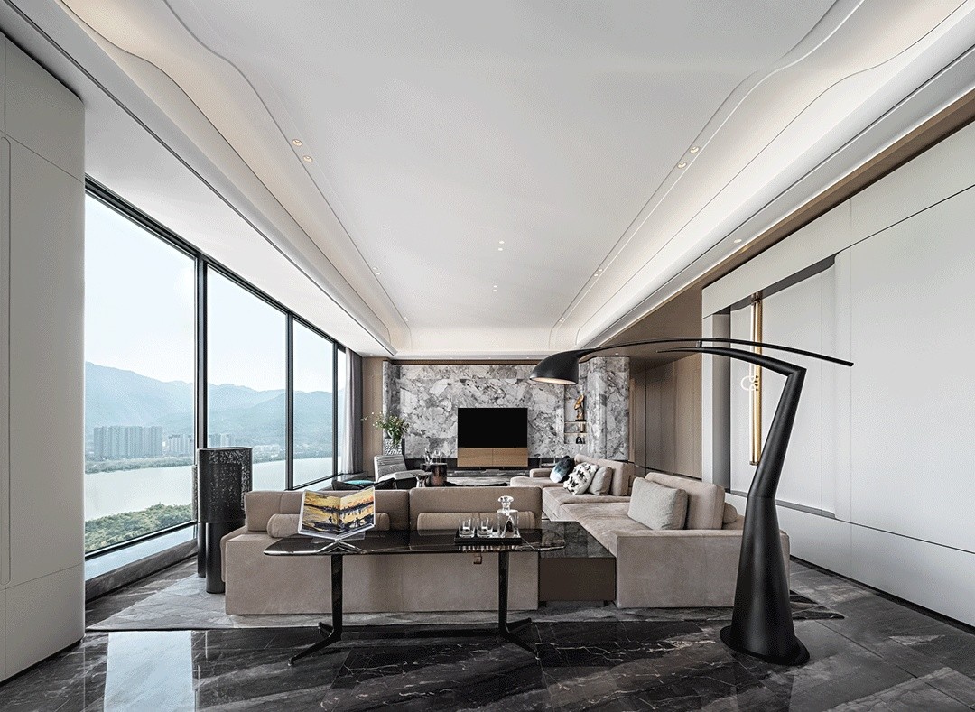 設計理念:開放式的客廳格局,因一側納入自然景觀的巨幕玻璃顯得更為開闊。垂向挑高,得以適配大窗景的氣度。本應風平浪靜的天花卻在此時掀起了波瀾,與窗景呼應,與內景協調。正如蘊藏的設計小心思被發現一般,靈動躍于其中。柔軟細膩的絨,與大理石的奢華質感碰撞。