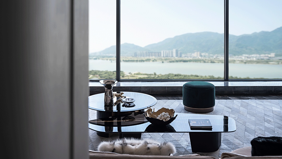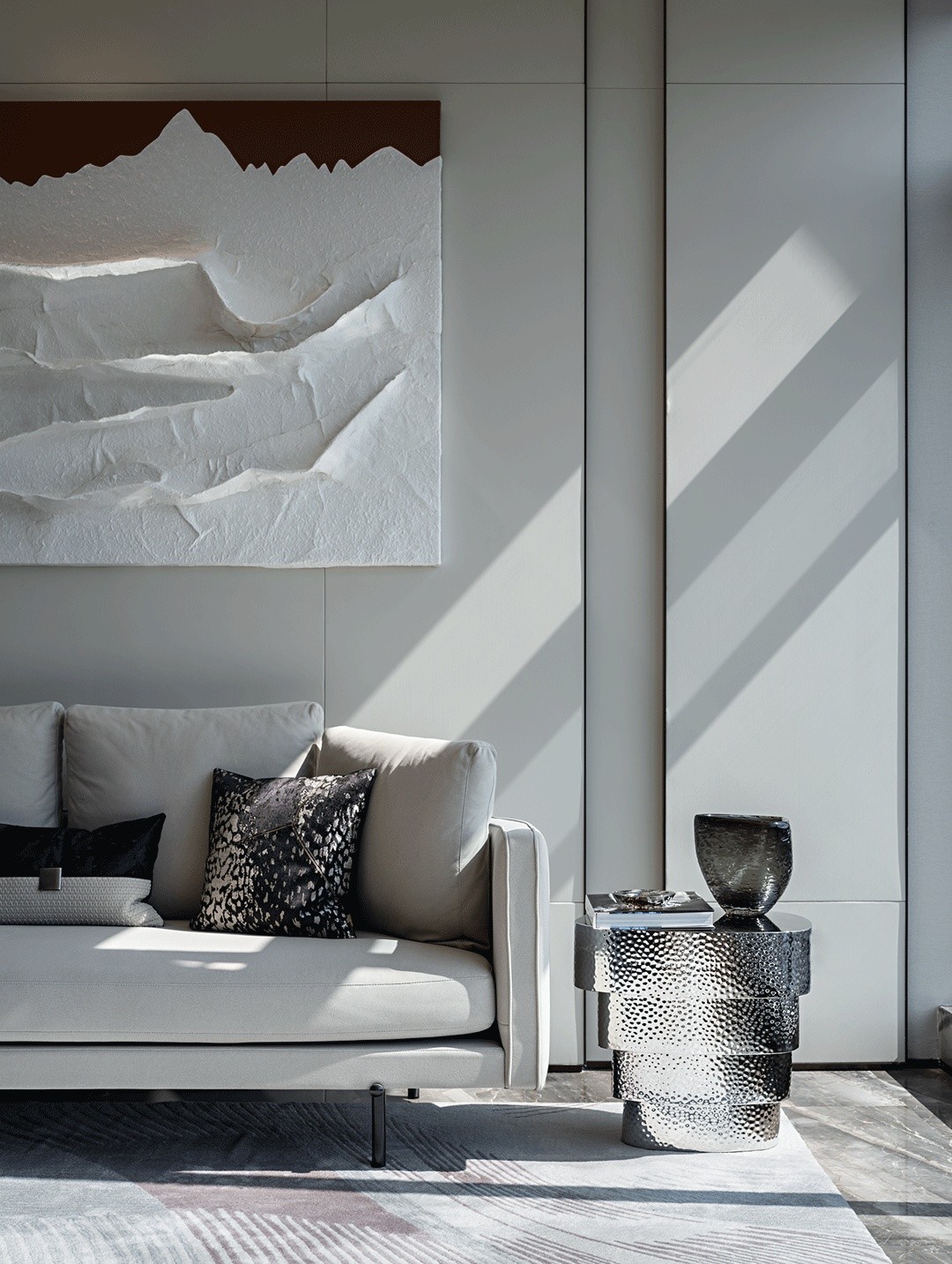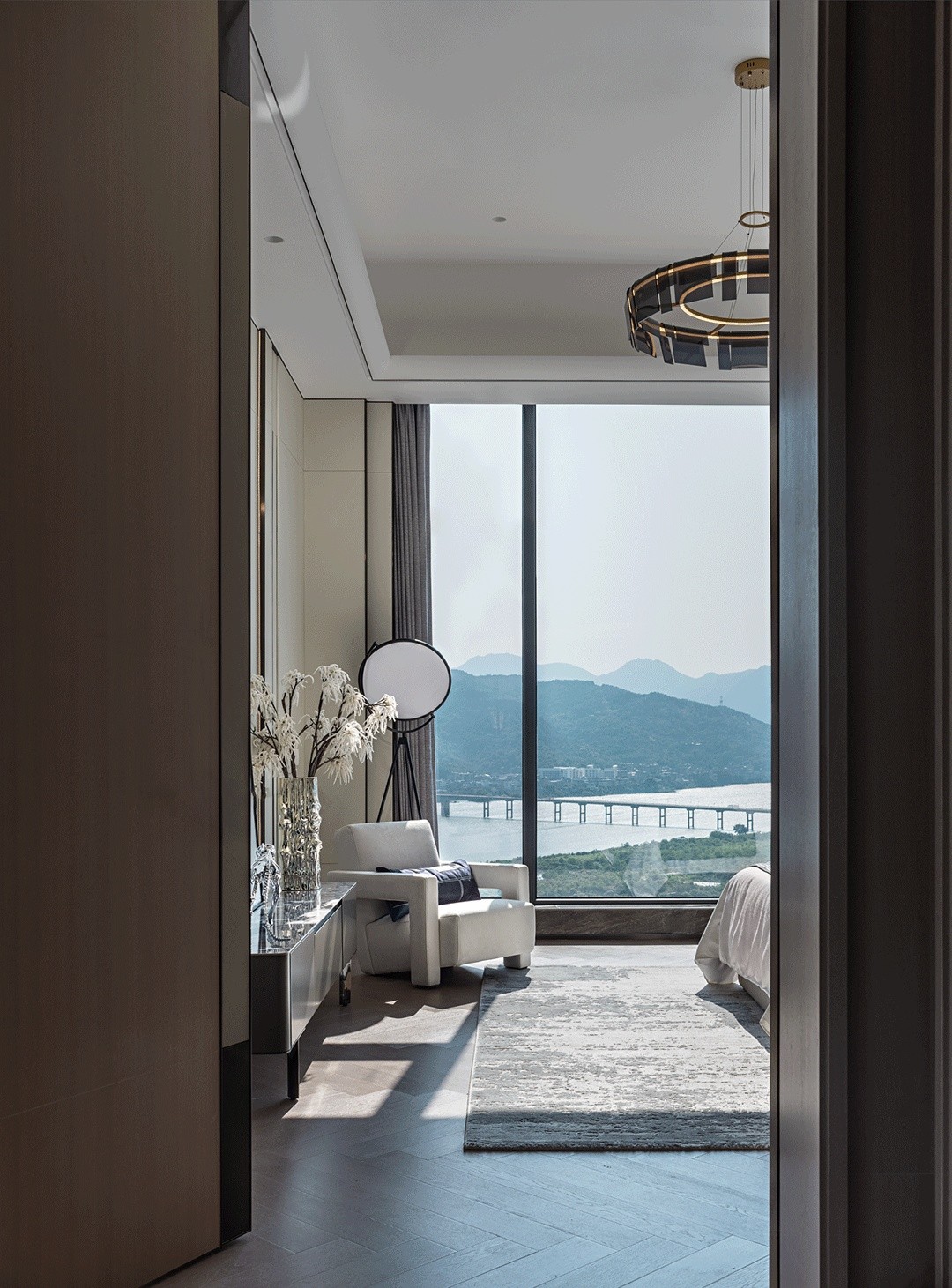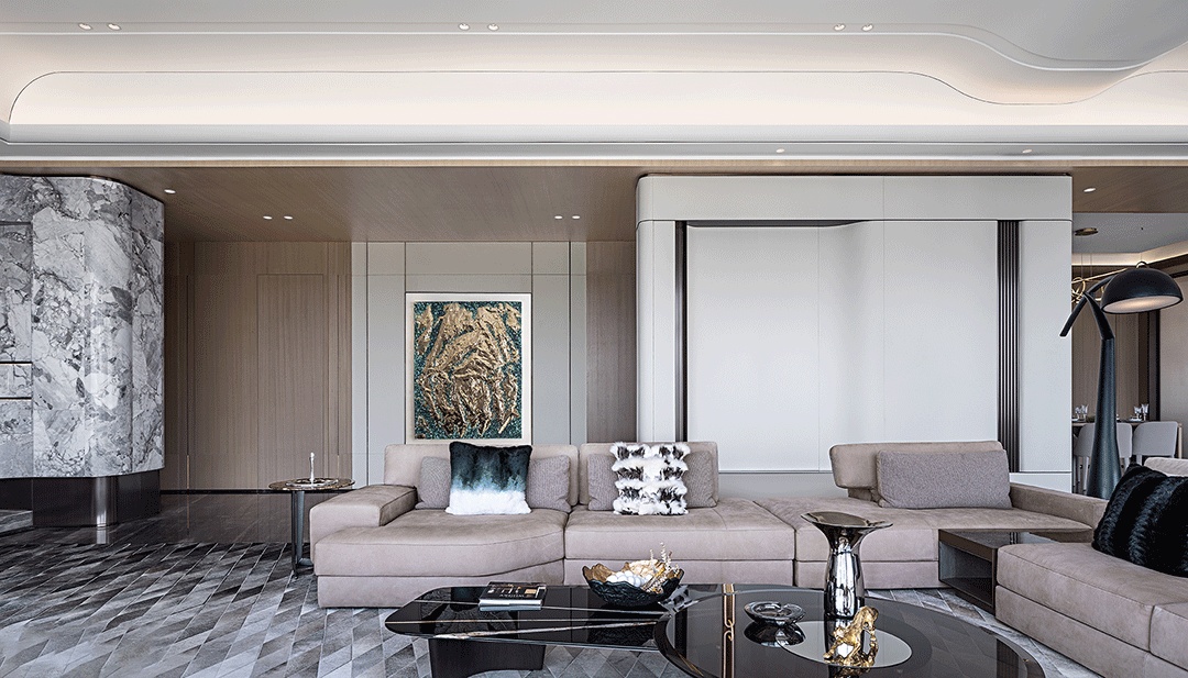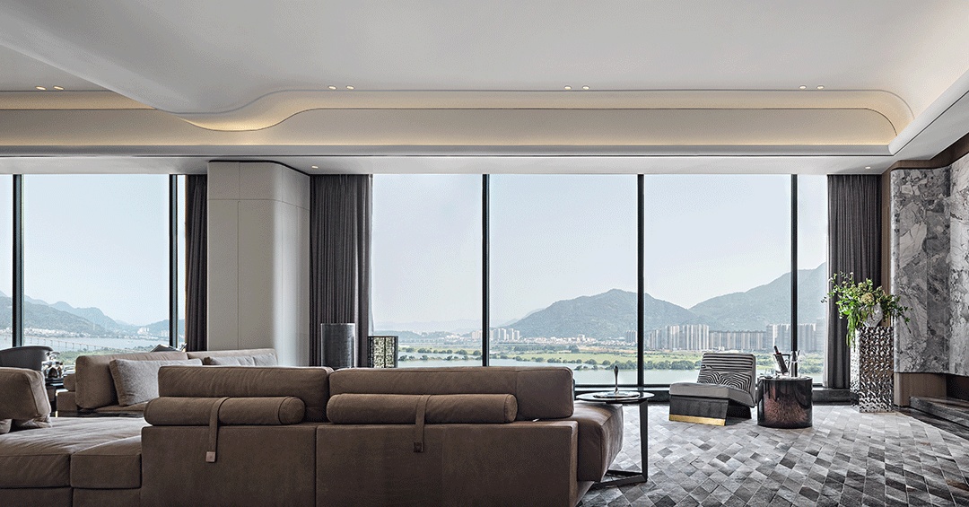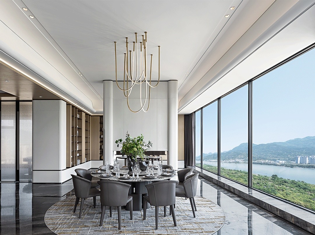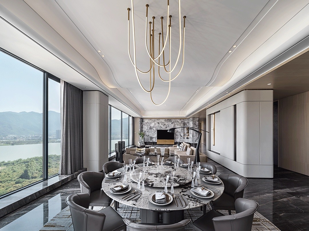 設計理念:開放式的客廳格局,因一側納入自然景觀的巨幕玻璃顯得更為開闊。垂向挑高,得以適配大窗景的氣度。本應風平浪靜的天花卻在此時掀起了波瀾,與窗景呼應,與內景協調。正如蘊藏的設計小心思被發現一般,靈動躍于其中。柔軟細膩的絨,與大理石的奢華質感碰撞。