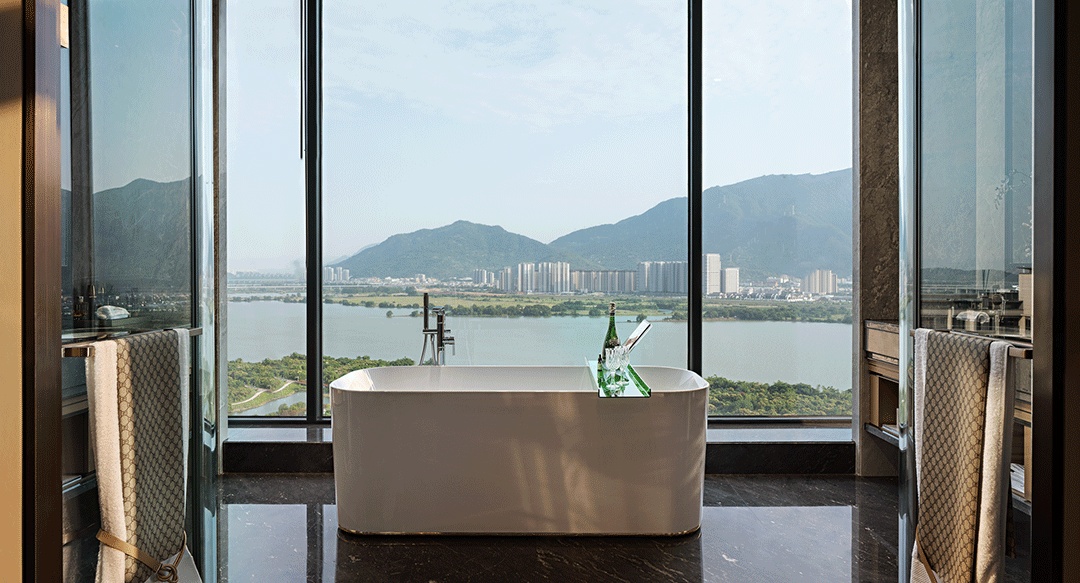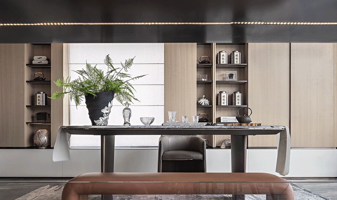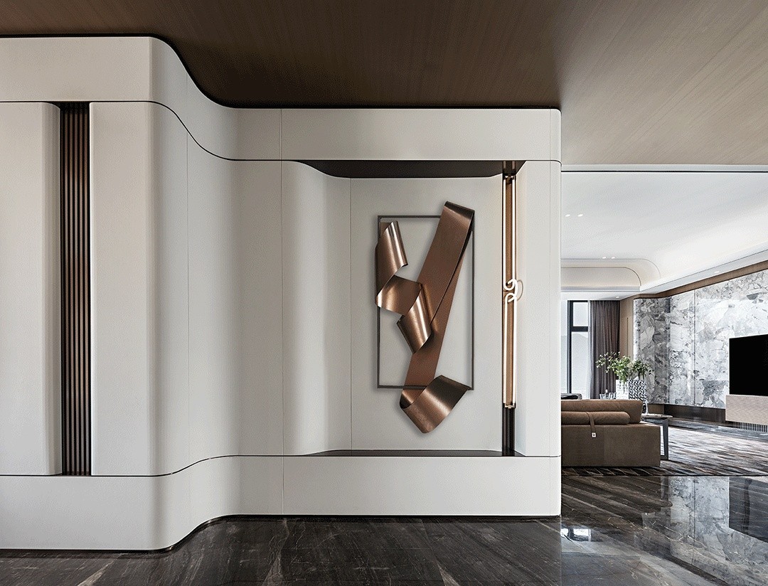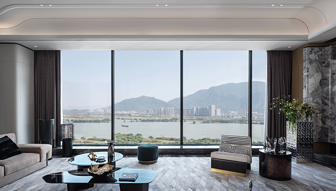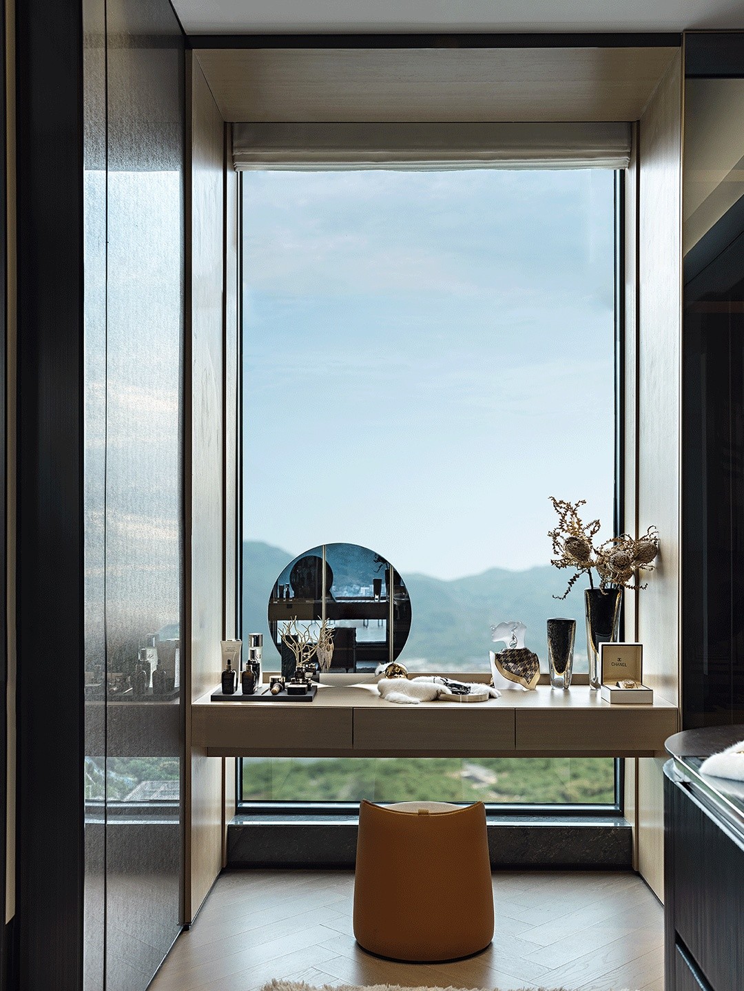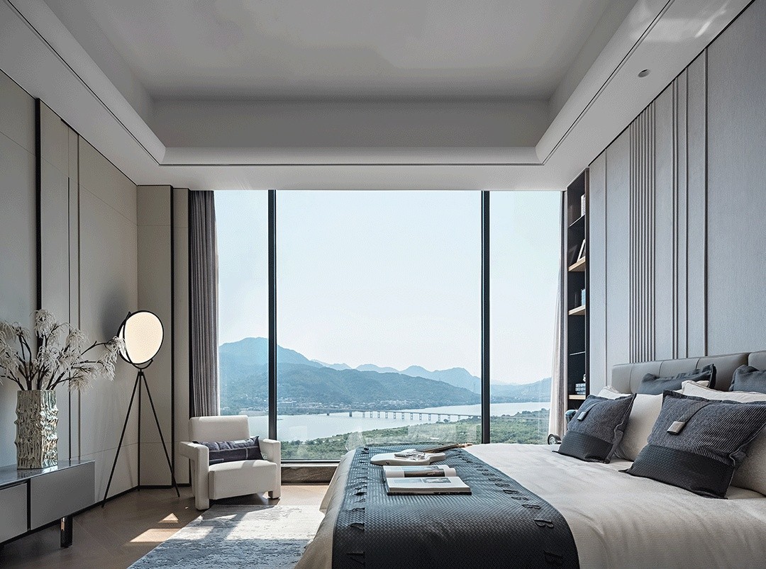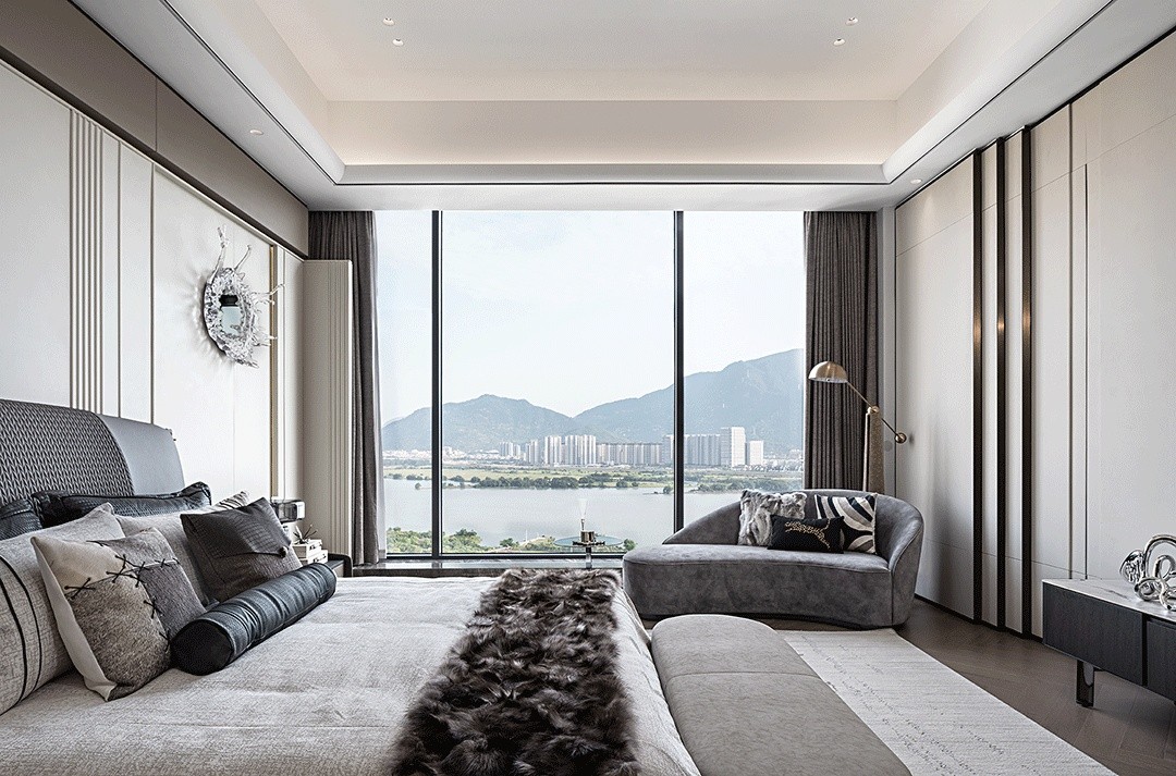 設計理念:開放式的客廳格局,因一側納入自然景觀的巨幕玻璃顯得更為開闊。垂向挑高,得以適配大窗景的氣度。本應風平浪靜的天花卻在此時掀起了波瀾,與窗景呼應,與內景協調。正如蘊藏的設計小心思被發現一般,靈動躍于其中。柔軟細膩的絨,與大理石的奢華質感碰撞。