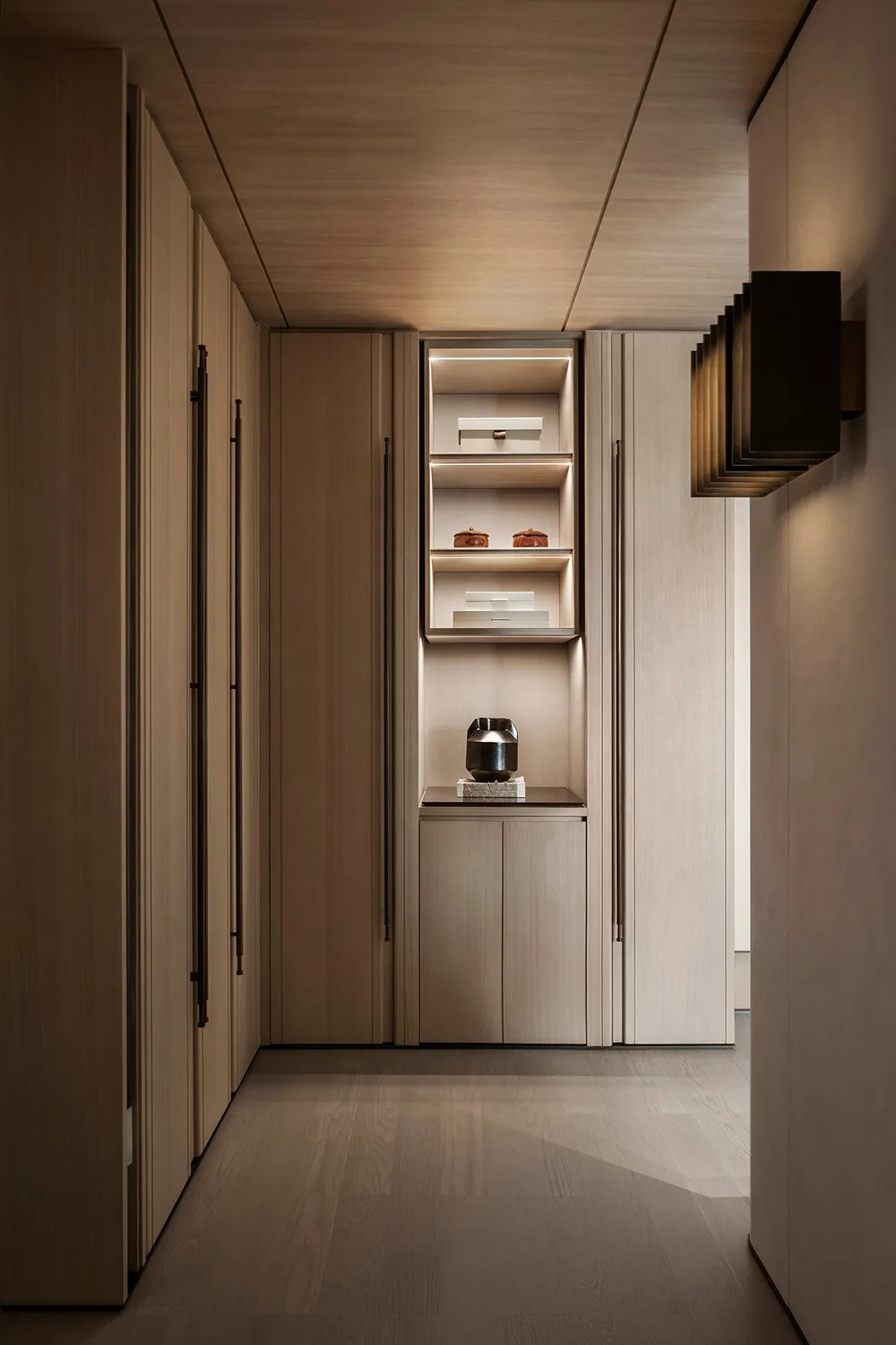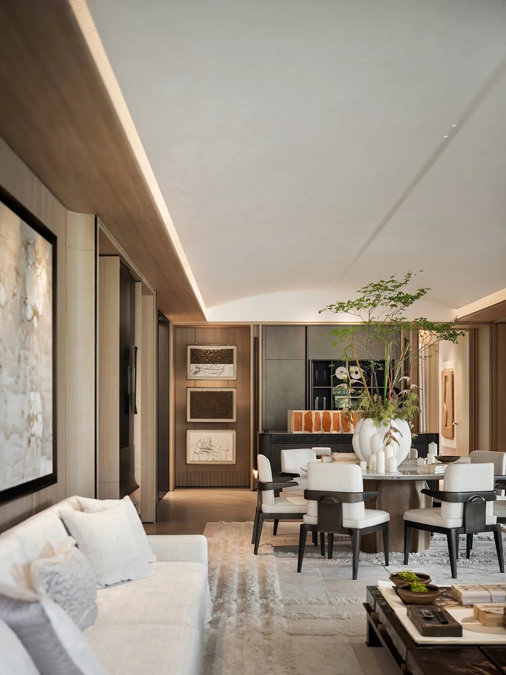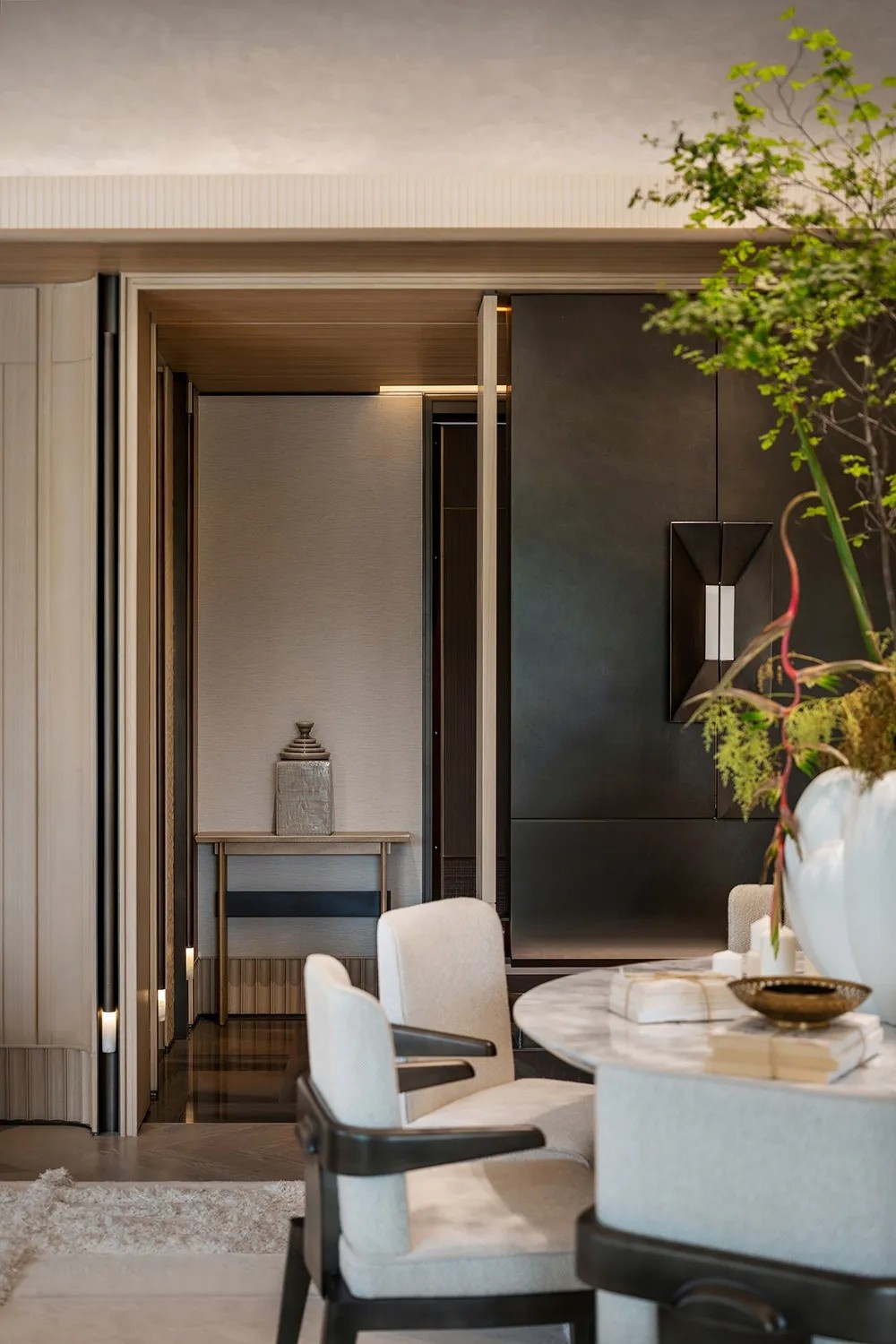 設計理念:弧形吊頂歷經七重打磨,終成一片凝固的夜空。燈光游走時,紋理如星軌流轉,又如微風掠過湖心泛起的褶皺。落地窗是自然的畫框,將四季晨昏框作一幅動態長卷。在此落座,仿若置身時間之外,與湖光對飲,與星辰同眠。西廚如社交劇場,中廚似隱士禪房。開合之間,移門劃出動靜的邊界,煙火氣與藝術感在此博弈共生。