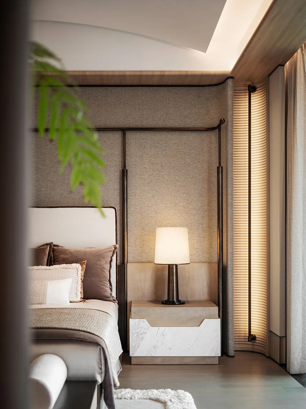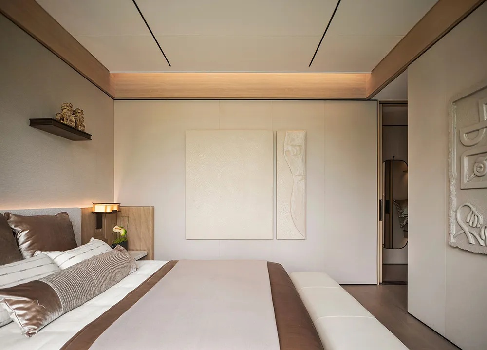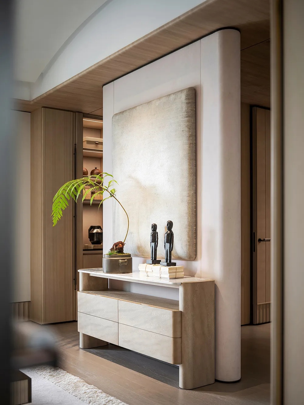 設計理念:弧形吊頂歷經七重打磨,終成一片凝固的夜空。燈光游走時,紋理如星軌流轉,又如微風掠過湖心泛起的褶皺。落地窗是自然的畫框,將四季晨昏框作一幅動態長卷。在此落座,仿若置身時間之外,與湖光對飲,與星辰同眠。西廚如社交劇場,中廚似隱士禪房。開合之間,移門劃出動靜的邊界,煙火氣與藝術感在此博弈共生。