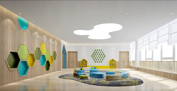 設計理念:幼兒園整體以現代化風格為主。中庭虛擬的深林設計給整體空間增添了童真爛漫的氛圍,教學區分隔墻上的水滴形鏤空設計,孩子們可以在課余時間自由穿梭,不僅增強了整體空間的美學構圖性,也提升了教室設計的活力與互動性。