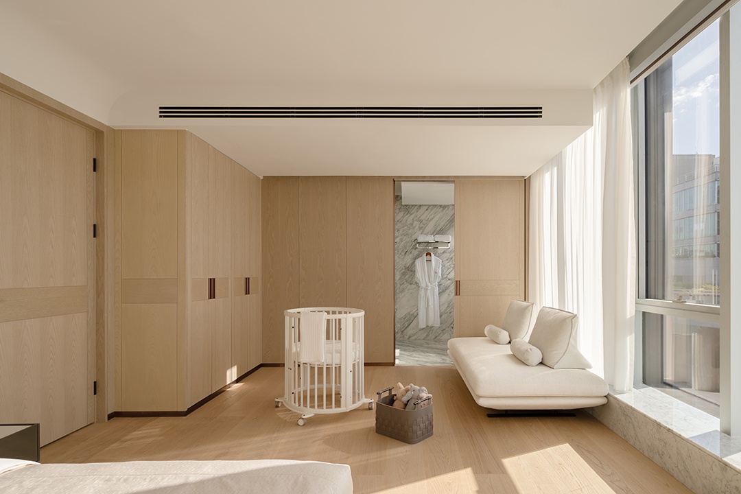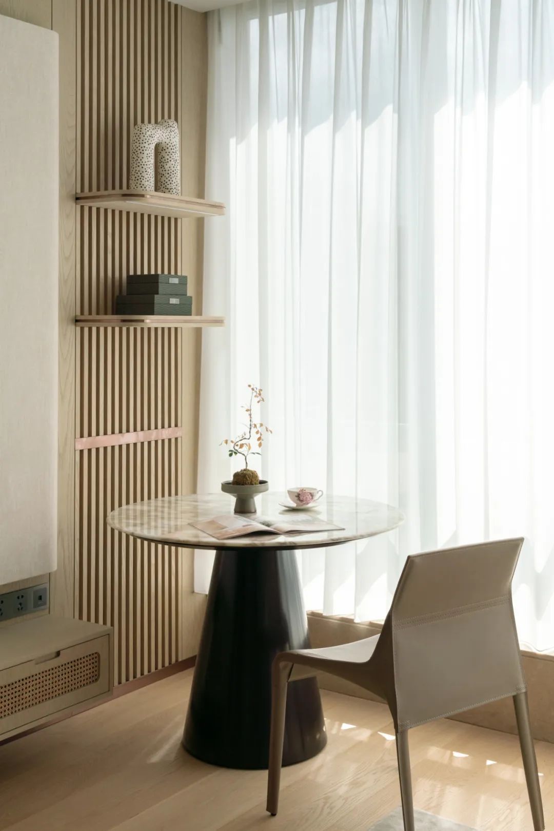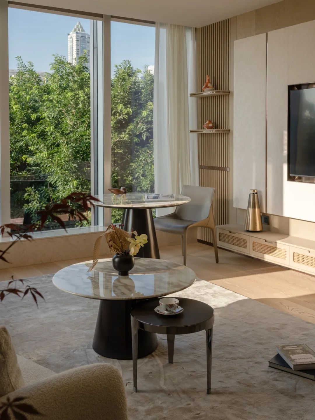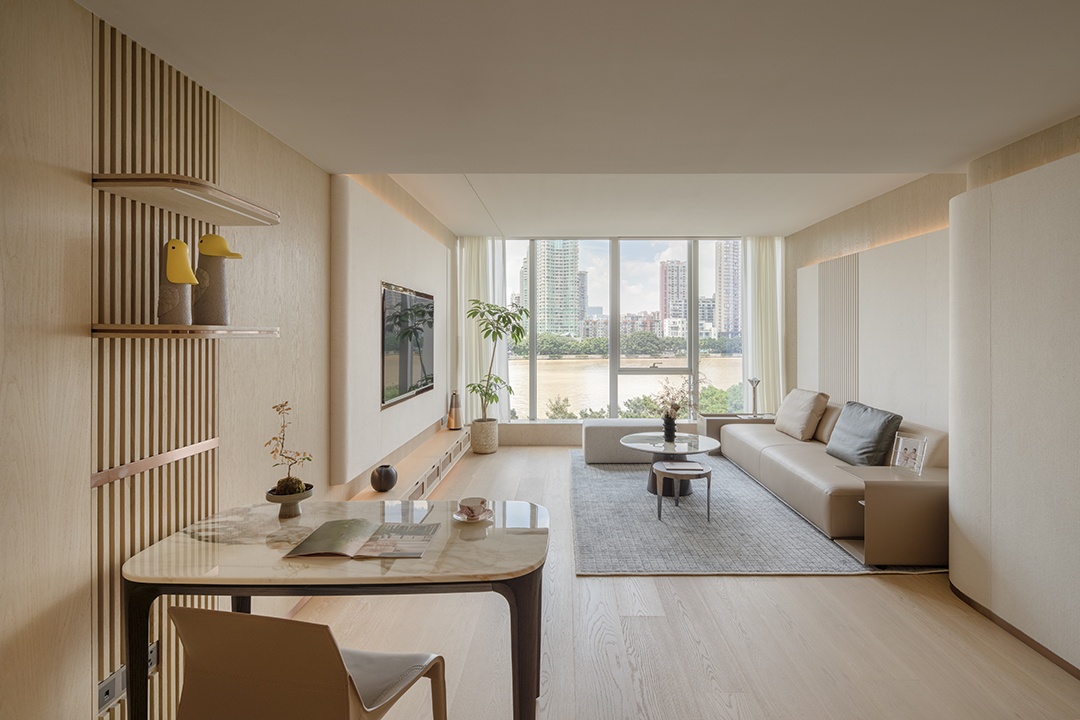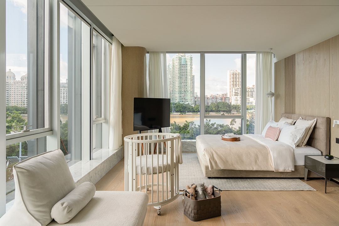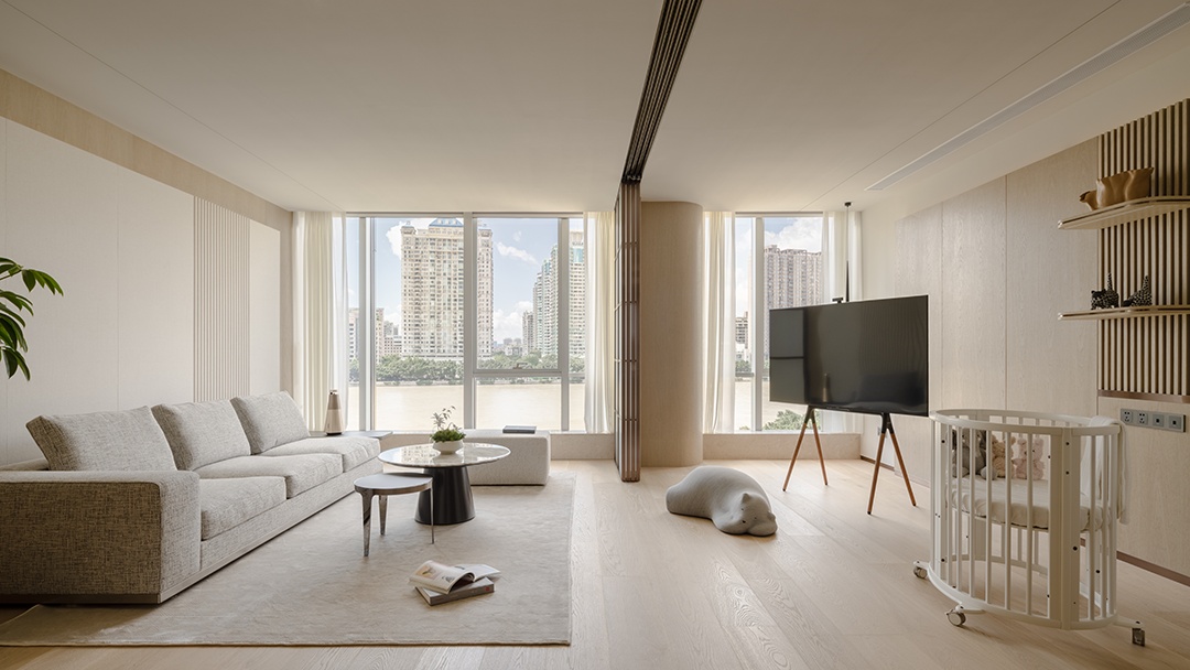 設計理念:遵循探索空間更多可能性的原則,從建筑、景觀再到室內,尊重自然環境,并嘗試將二沙島這獨特可貴的自然景色引入室內,讓生活居所離自然更進一步,感受純粹的身心放松和療愈方式。大落地玻璃窗將外部的自然風景打開并化呈現,這是再多的人工配飾也無法比擬的。綠色代表著孕育生命與希望,帶來平靜的情緒,創造放松的基調,十分適合擁有新生兒和新生活的溫暖新家。