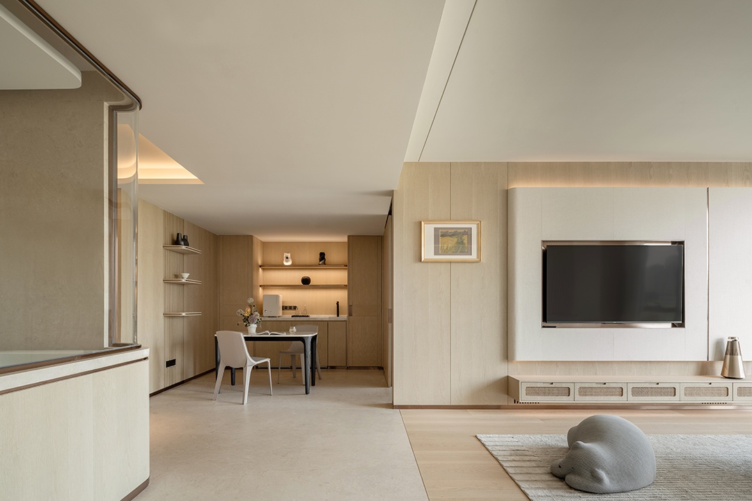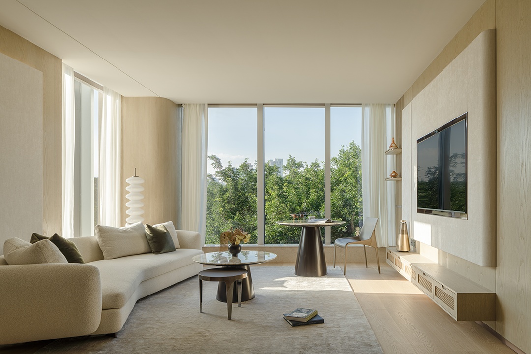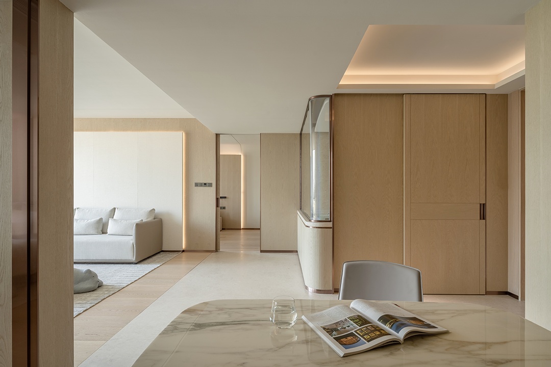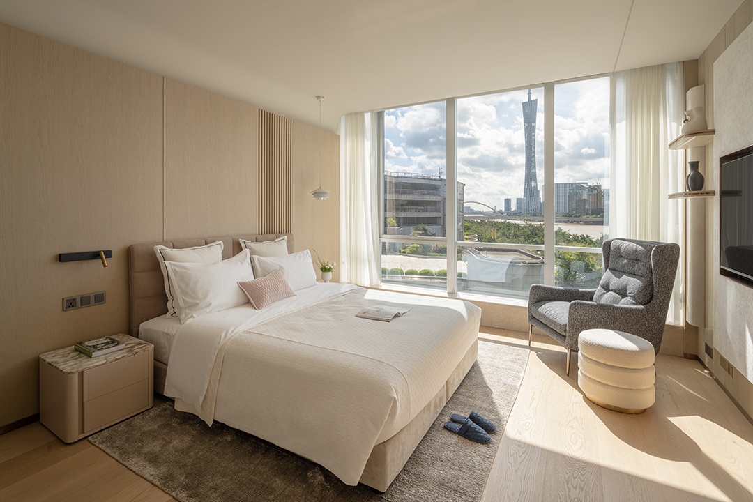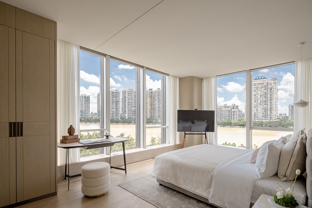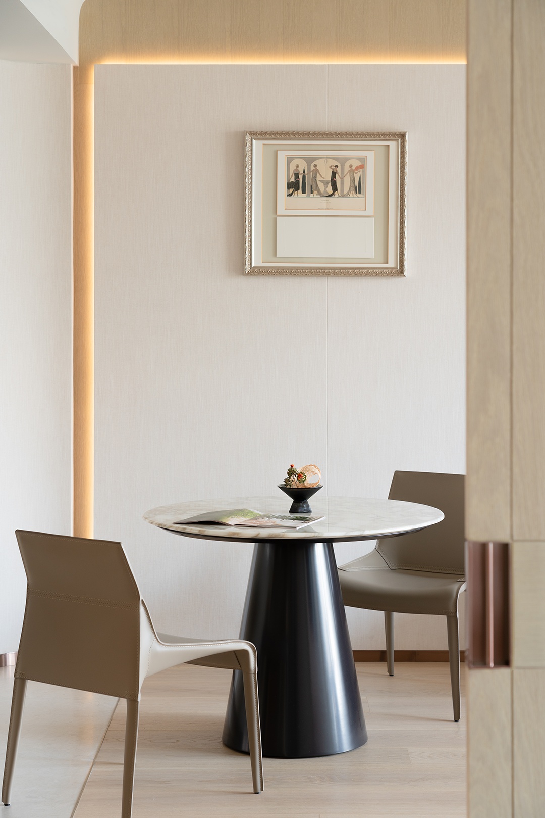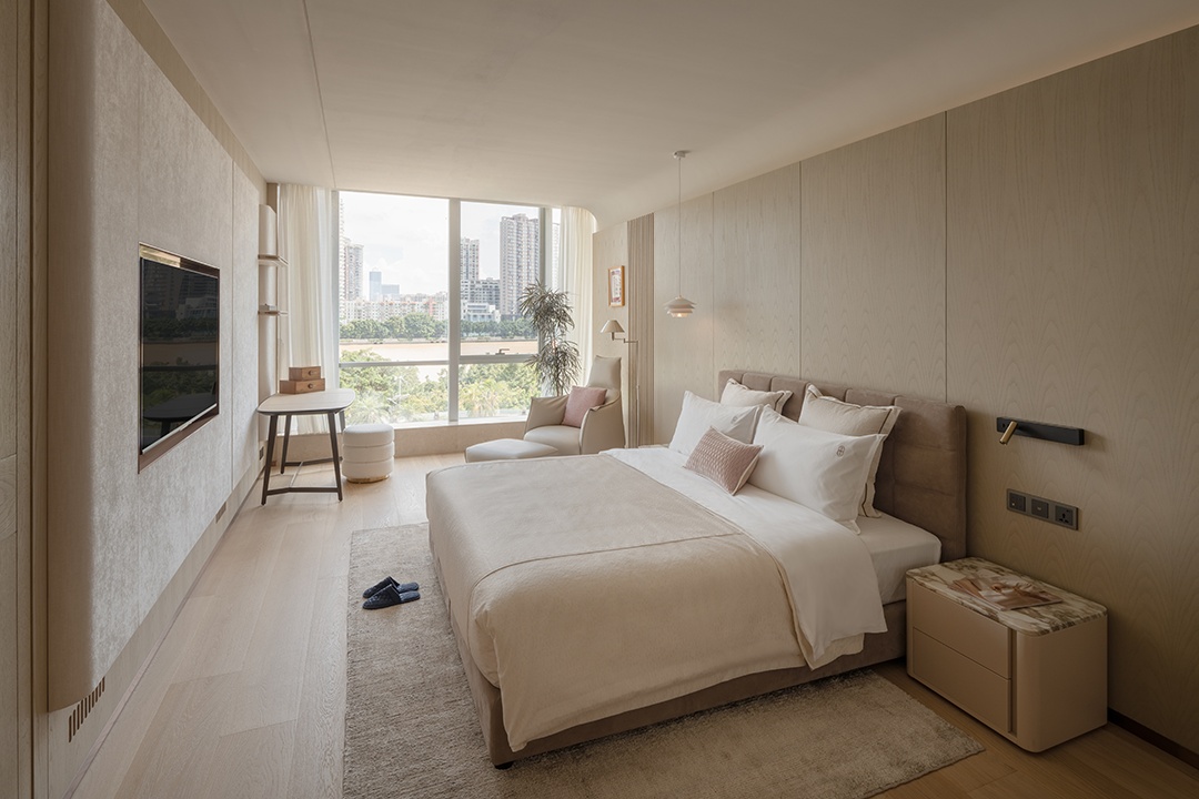 設計理念:遵循探索空間更多可能性的原則,從建筑、景觀再到室內,尊重自然環境,并嘗試將二沙島這獨特可貴的自然景色引入室內,讓生活居所離自然更進一步,感受純粹的身心放松和療愈方式。大落地玻璃窗將外部的自然風景打開并化呈現,這是再多的人工配飾也無法比擬的。綠色代表著孕育生命與希望,帶來平靜的情緒,創造放松的基調,十分適合擁有新生兒和新生活的溫暖新家。