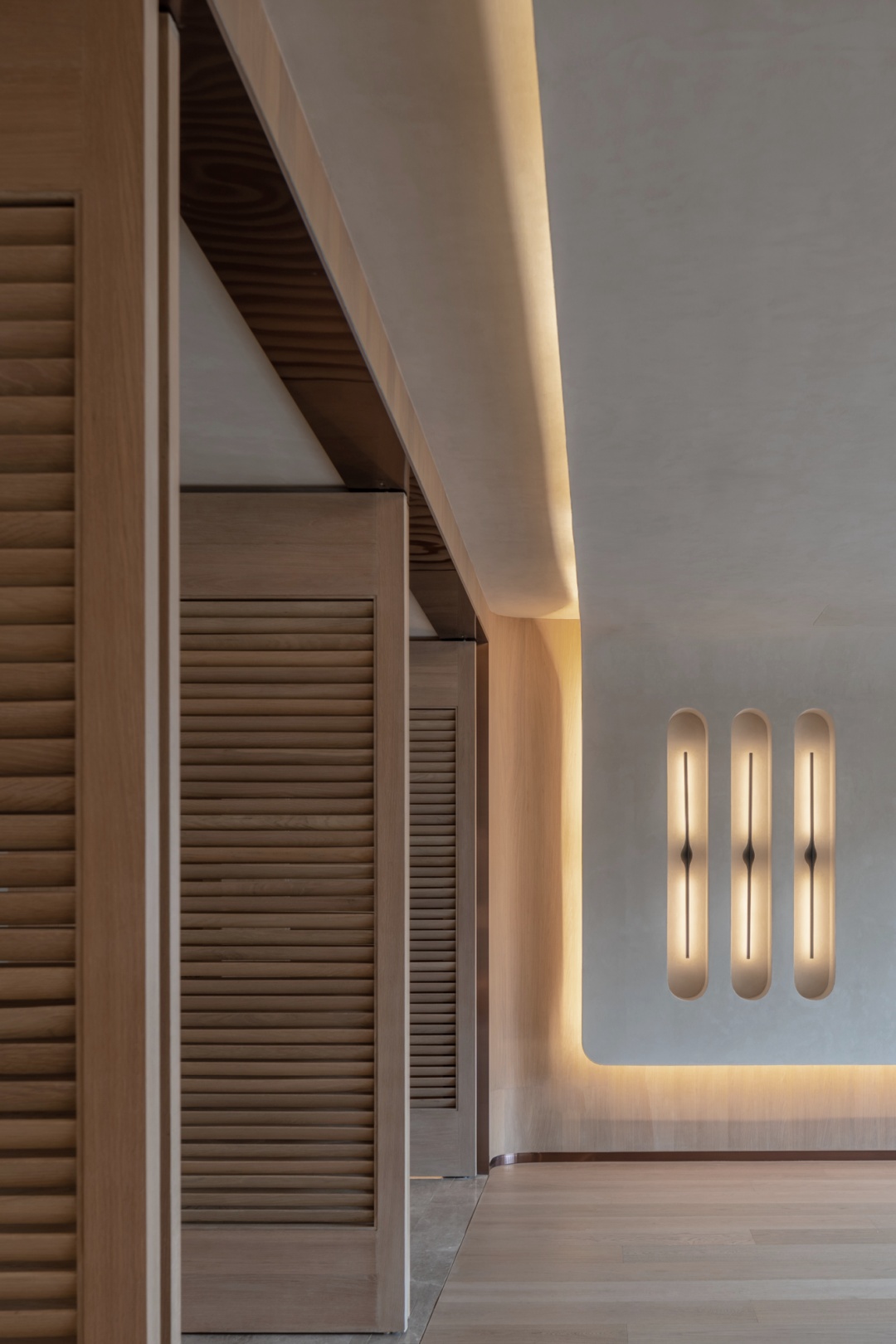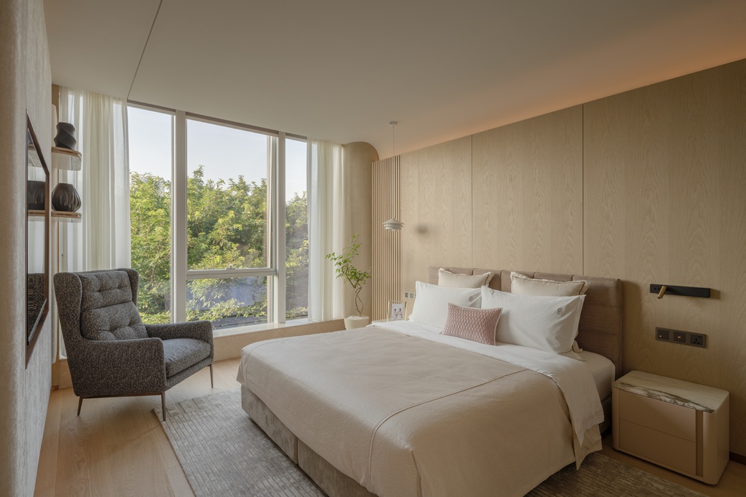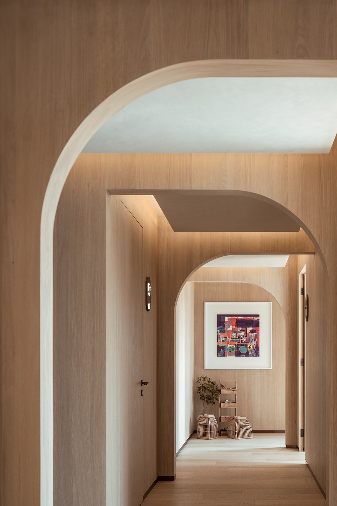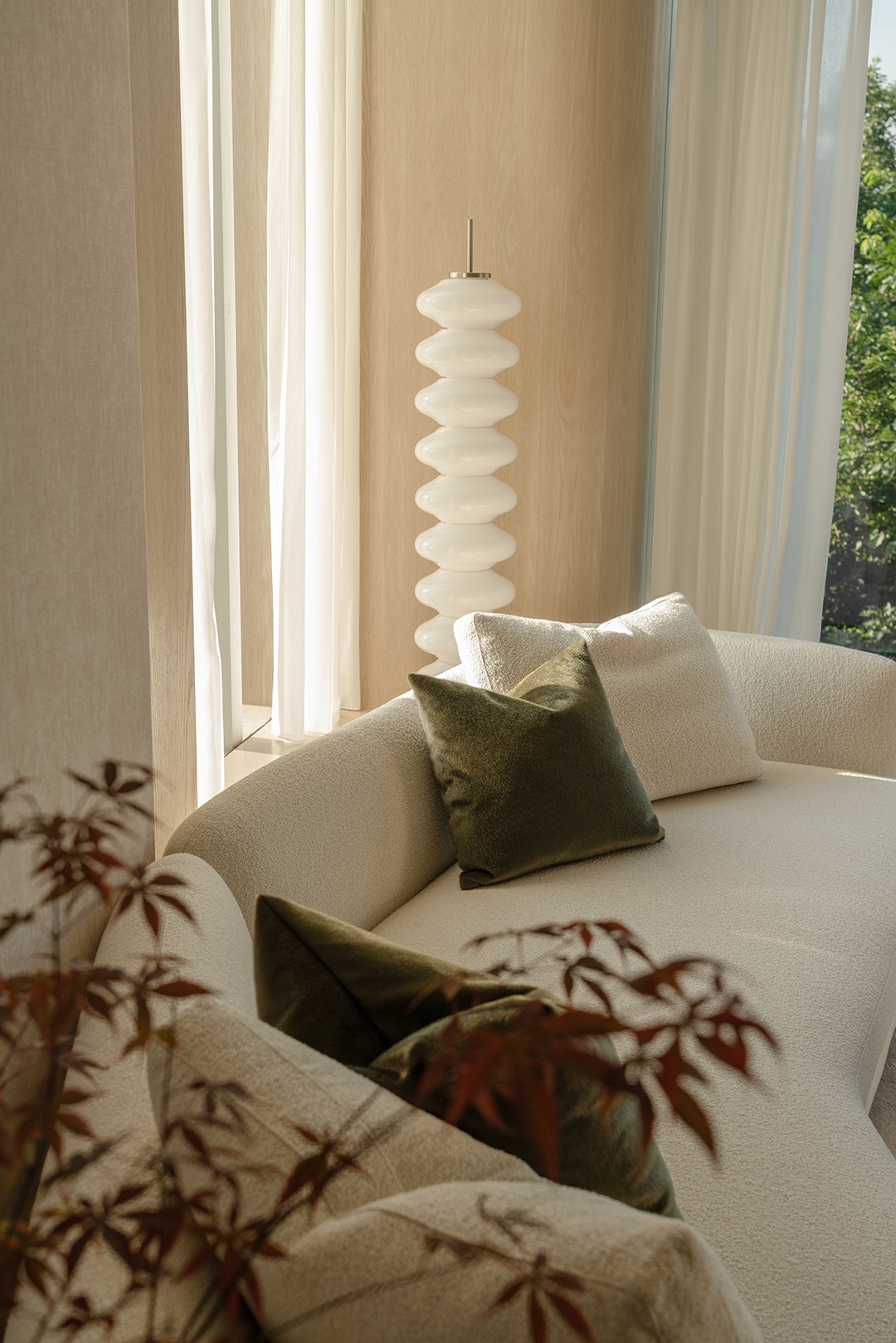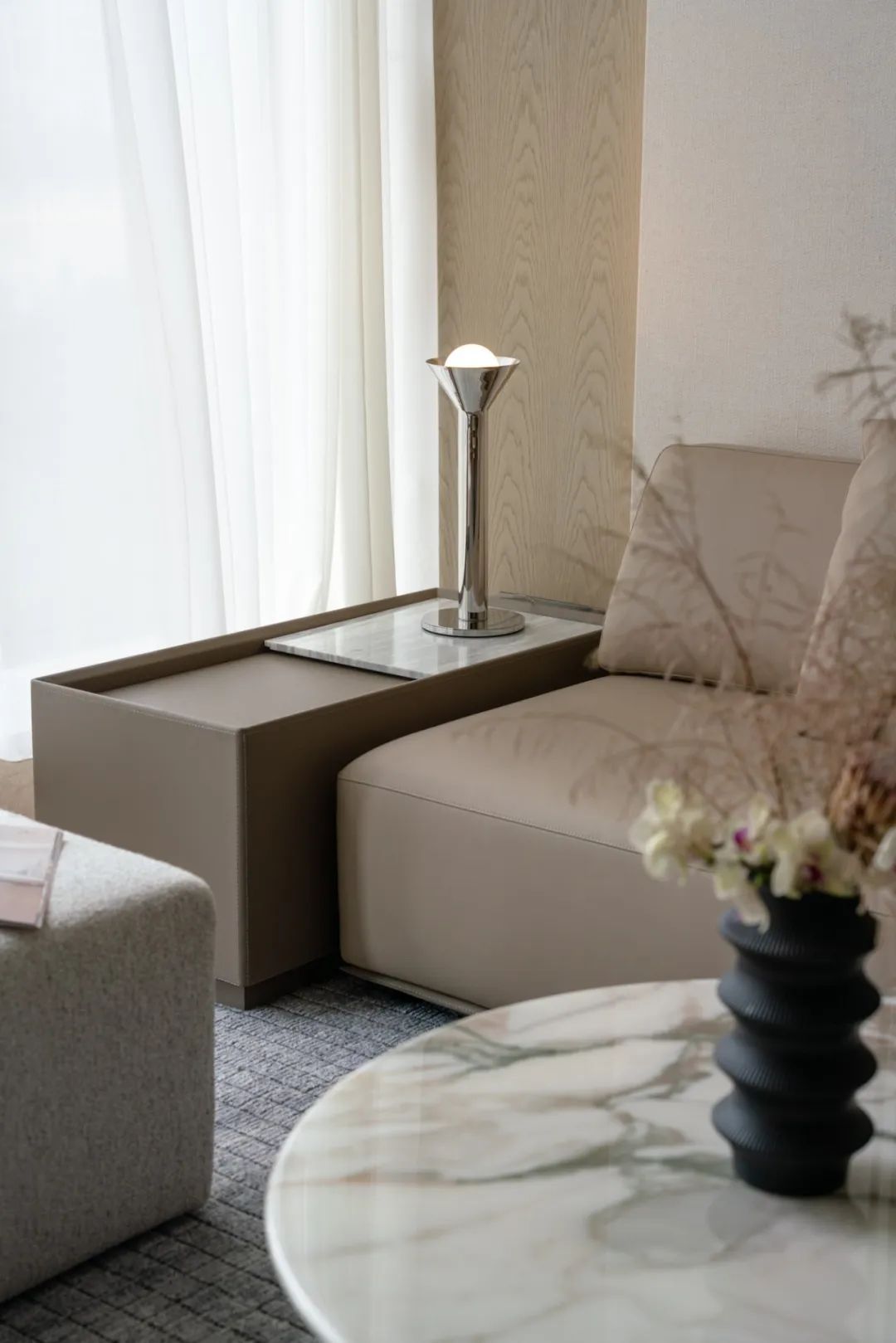 設計理念:遵循探索空間更多可能性的原則,從建筑、景觀再到室內,尊重自然環境,并嘗試將二沙島這獨特可貴的自然景色引入室內,讓生活居所離自然更進一步,感受純粹的身心放松和療愈方式。大落地玻璃窗將外部的自然風景打開并化呈現,這是再多的人工配飾也無法比擬的。綠色代表著孕育生命與希望,帶來平靜的情緒,創造放松的基調,十分適合擁有新生兒和新生活的溫暖新家。