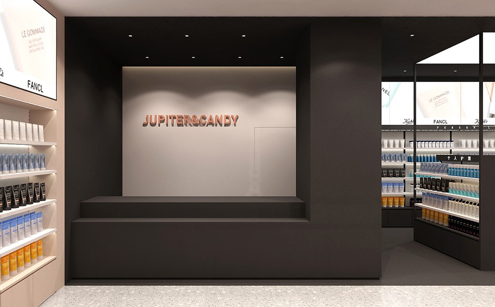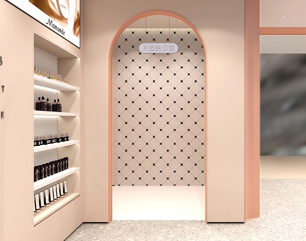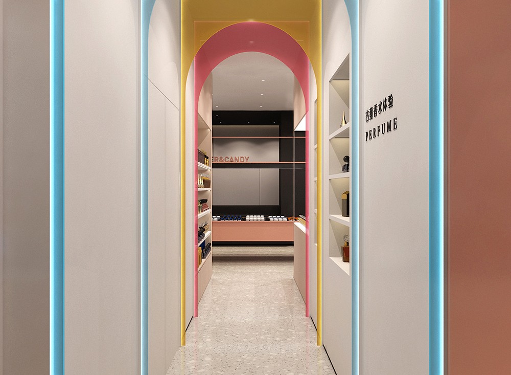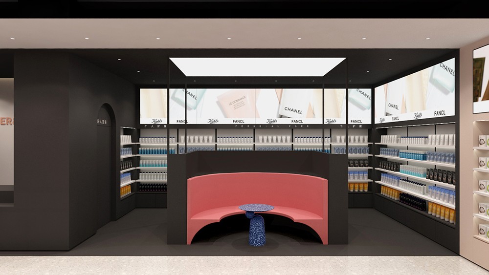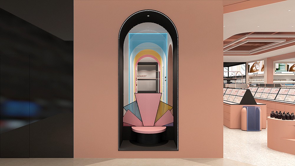 設計理念:通過功能分區及陳列方案引導消費動線,相互獨立同時又相互聯系的布局設計,縮短消費決策時間,同時啟發組合消費。細節設計考慮人群包容性,可視范圍內的推薦產品,合適高度的桌面/鏡面,隨手可取的試用品及清潔用品等。滿足愛美女性打卡、分享的需要,設計主題拍照墻,同時設計香水體驗專區、試妝區,通過五感互動加強體驗,讓每一個女性在空間里都感到舒適。