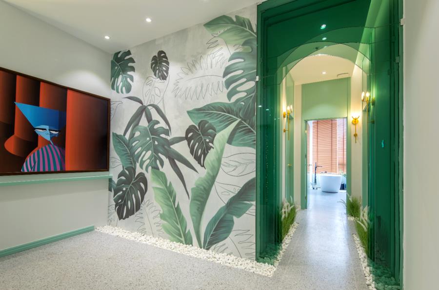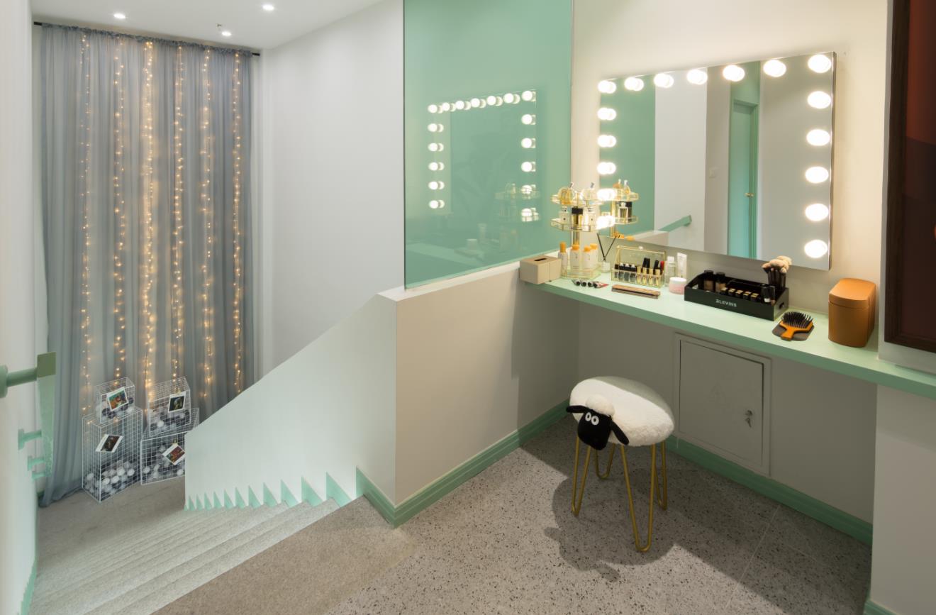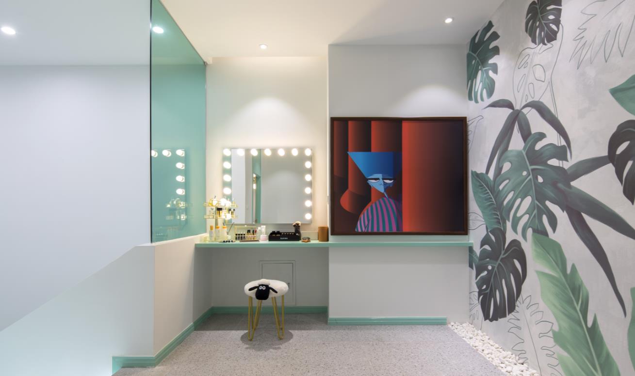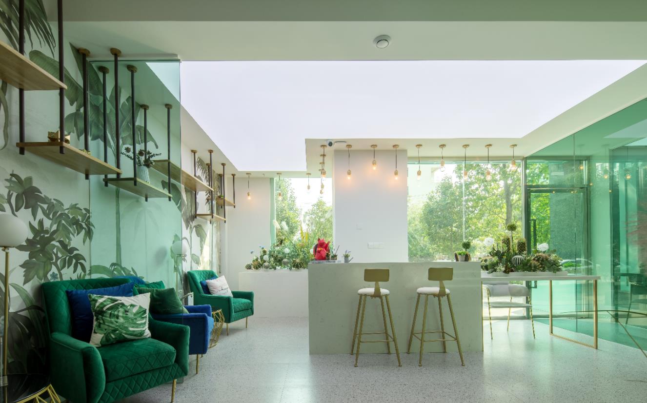 設計理念:綠色主調一路引導,配以簡約流暢的線條,營造明澈、通透、優雅的整體空間氣質。設計師采用室內外發光膜結合使用,在更好的為室內綠植打光的同時,使室內外形成延伸感。門廊彩色玻璃錯落層疊,搭配光的出現,輕盈、朦朧而富有層次。